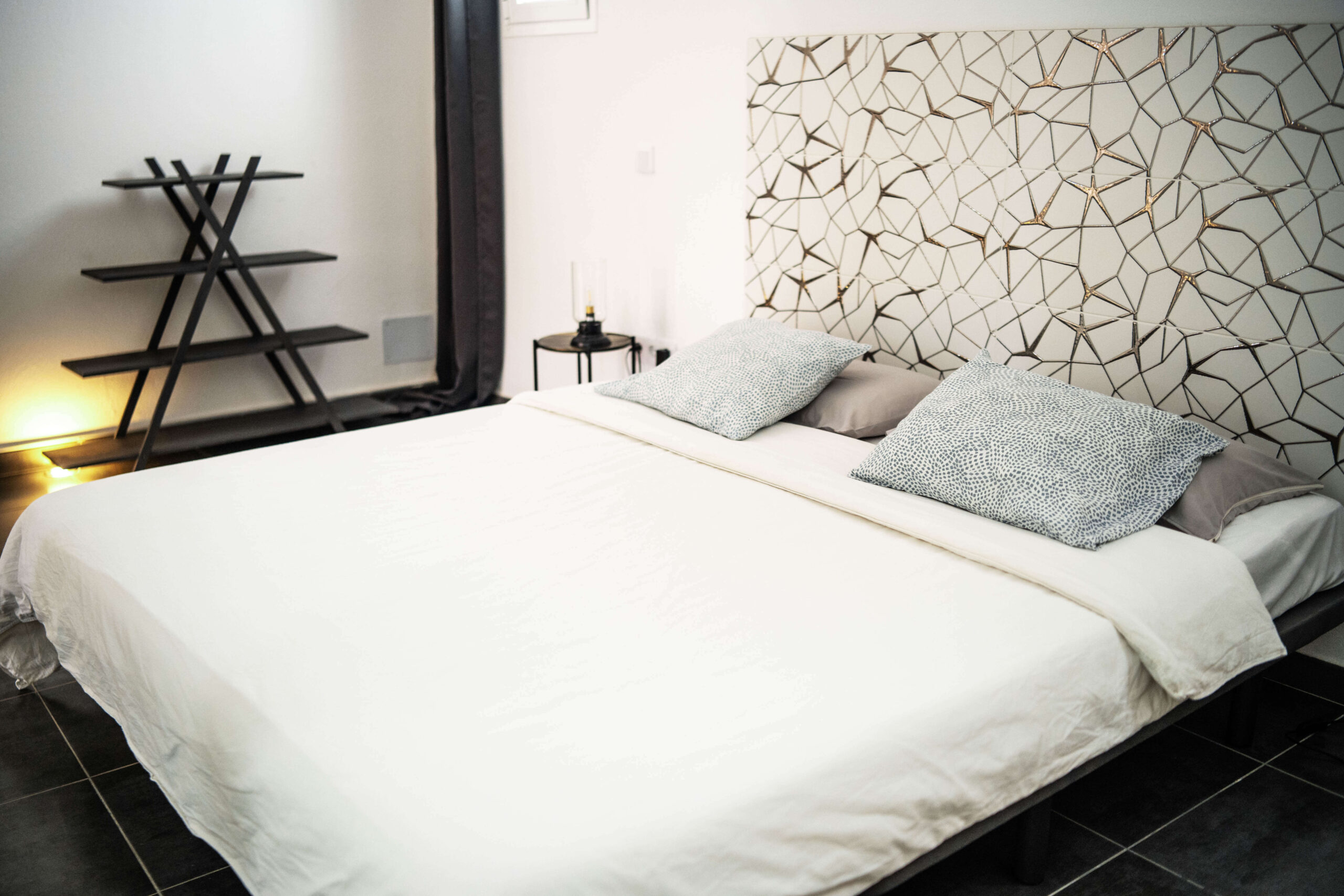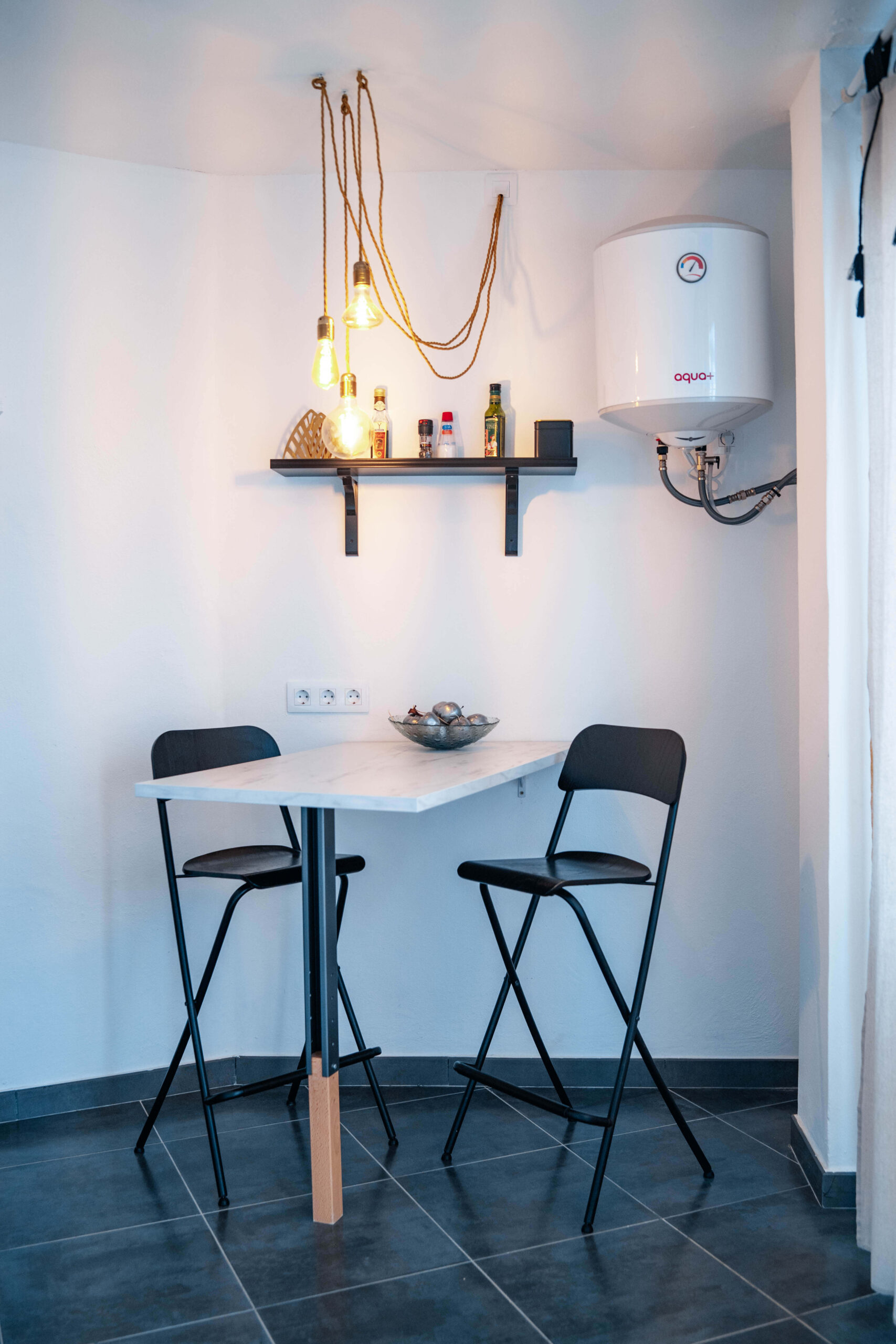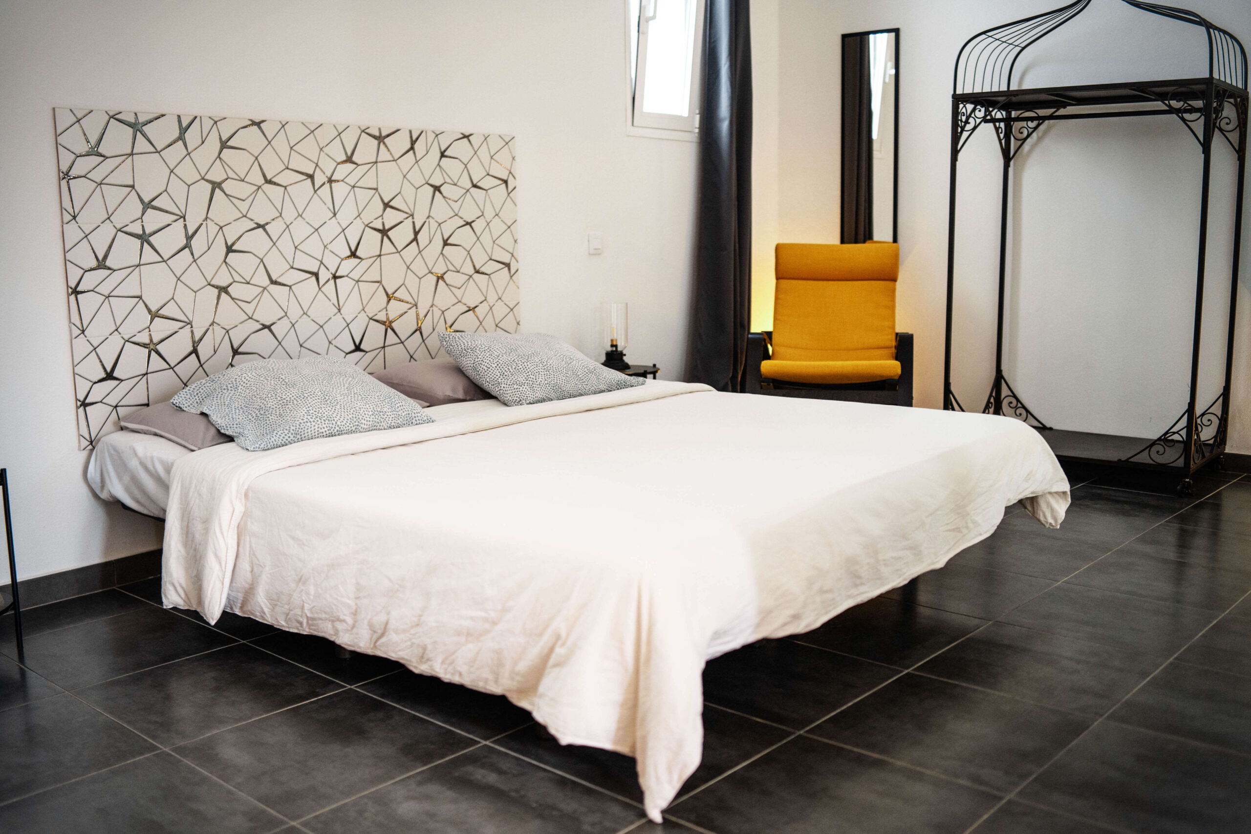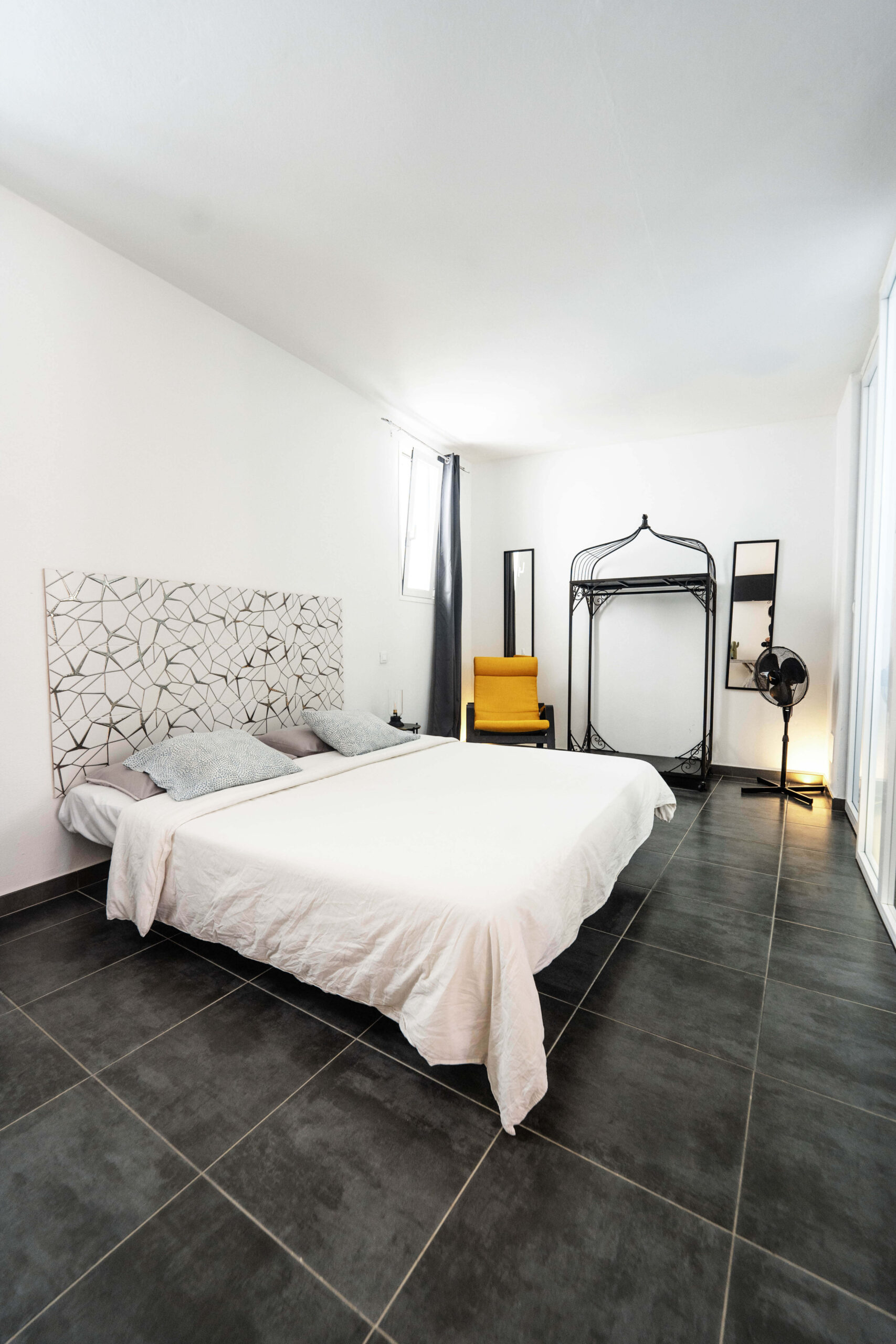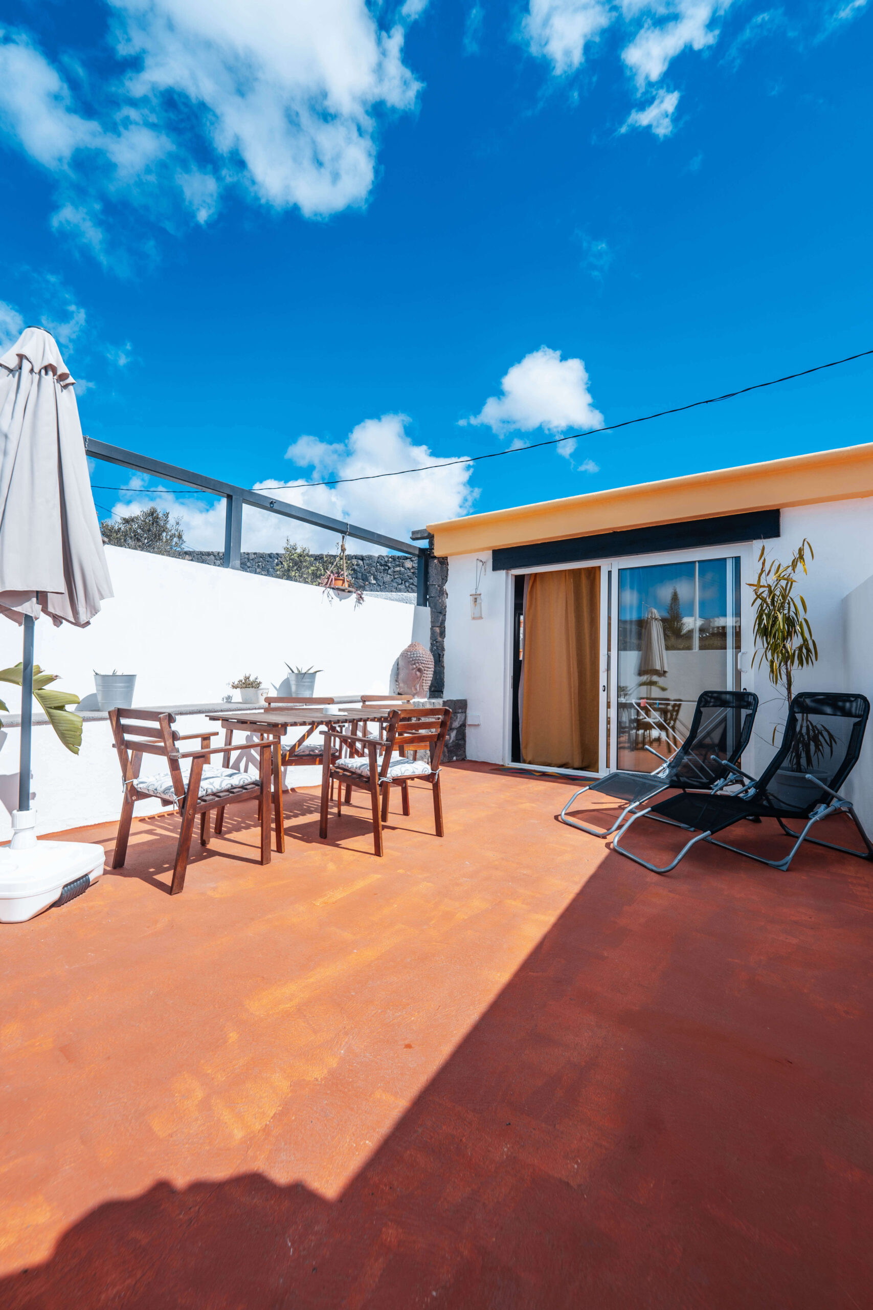 The Haria Studio is a newly constructed, 65 sqm apartment with a private 20 sqm terrace. The terrace includes a garden set, umbrella, and deckchairs with stunning views of Montaña Blanca volcano.