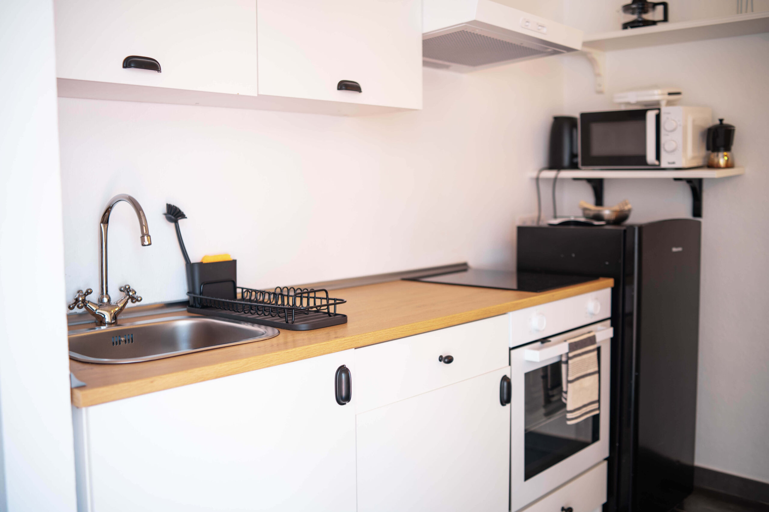 - Kitchen: Equipped with plates, pots, cutlery, glasses, oven, refrigerator, microwave, citrus juicer, toaster, coffee pot, and kettle.