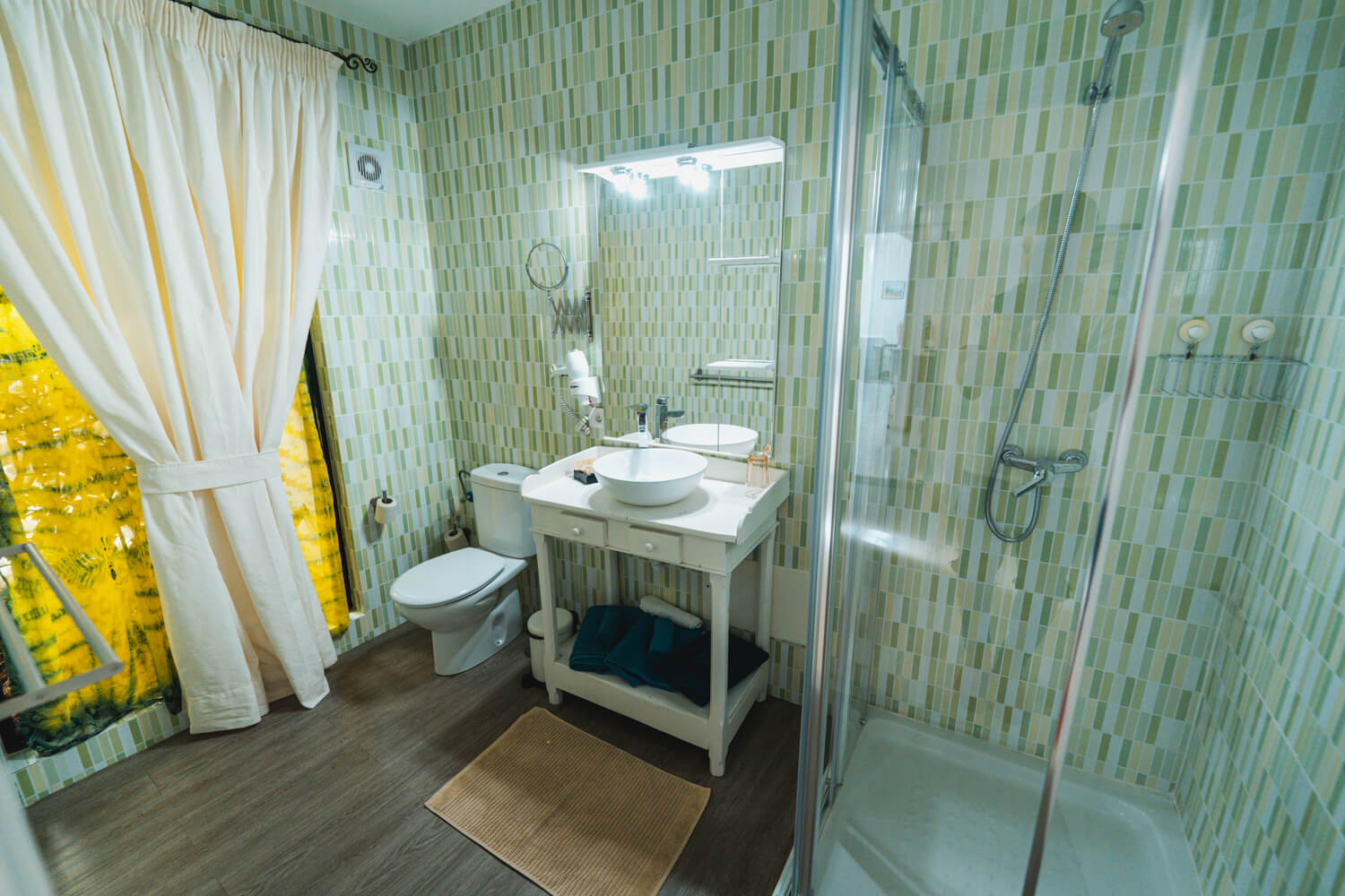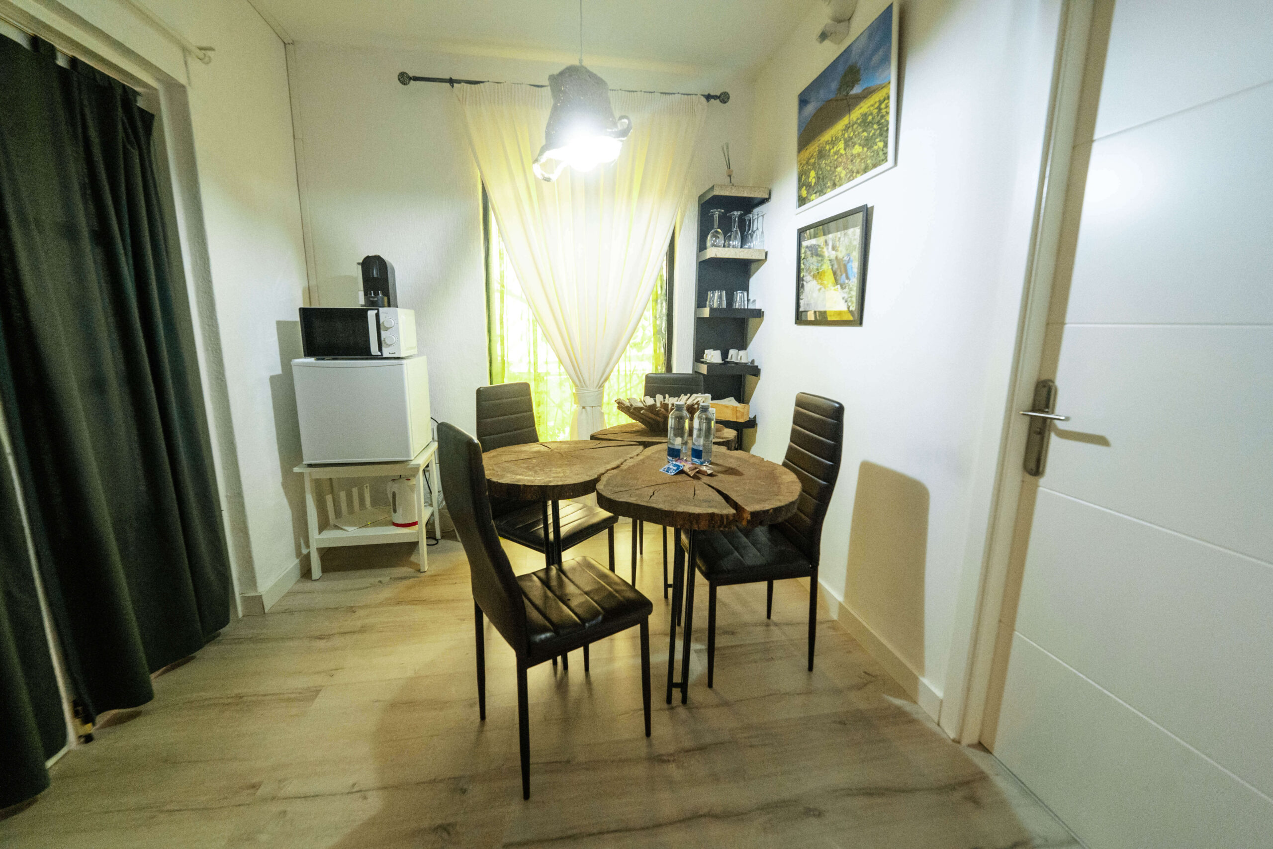 A room that is actually two rooms next to each other with two double beds for each room. One has a window, the other has a skylight that opens. Both have a very small living room where there is a table and a fridge, a capsule coffee machine, a kettle and a TV. The bathroom next to the rooms is private and with shower, sink, hair dryer. It is perfect for 4 people.