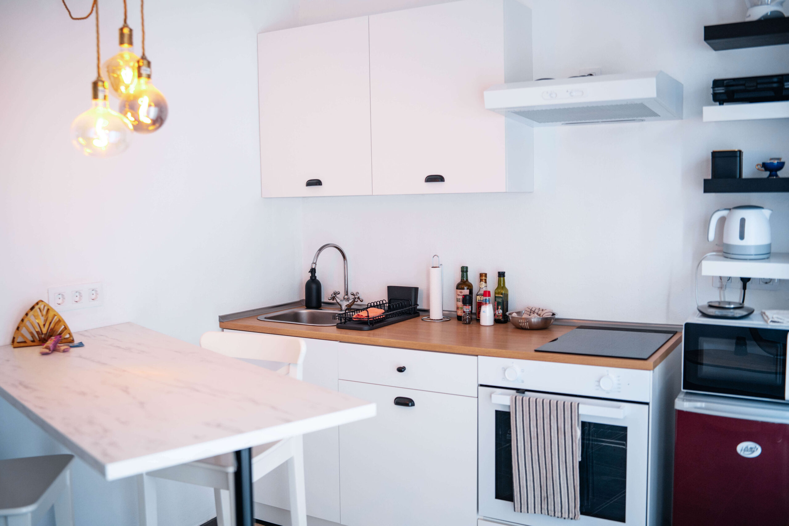 - Kitchen: Fully equipped with plates, pots, cutlery, glasses, oven, refrigerator, microwave, citrus juicer, toaster, coffee pot, and kettle.