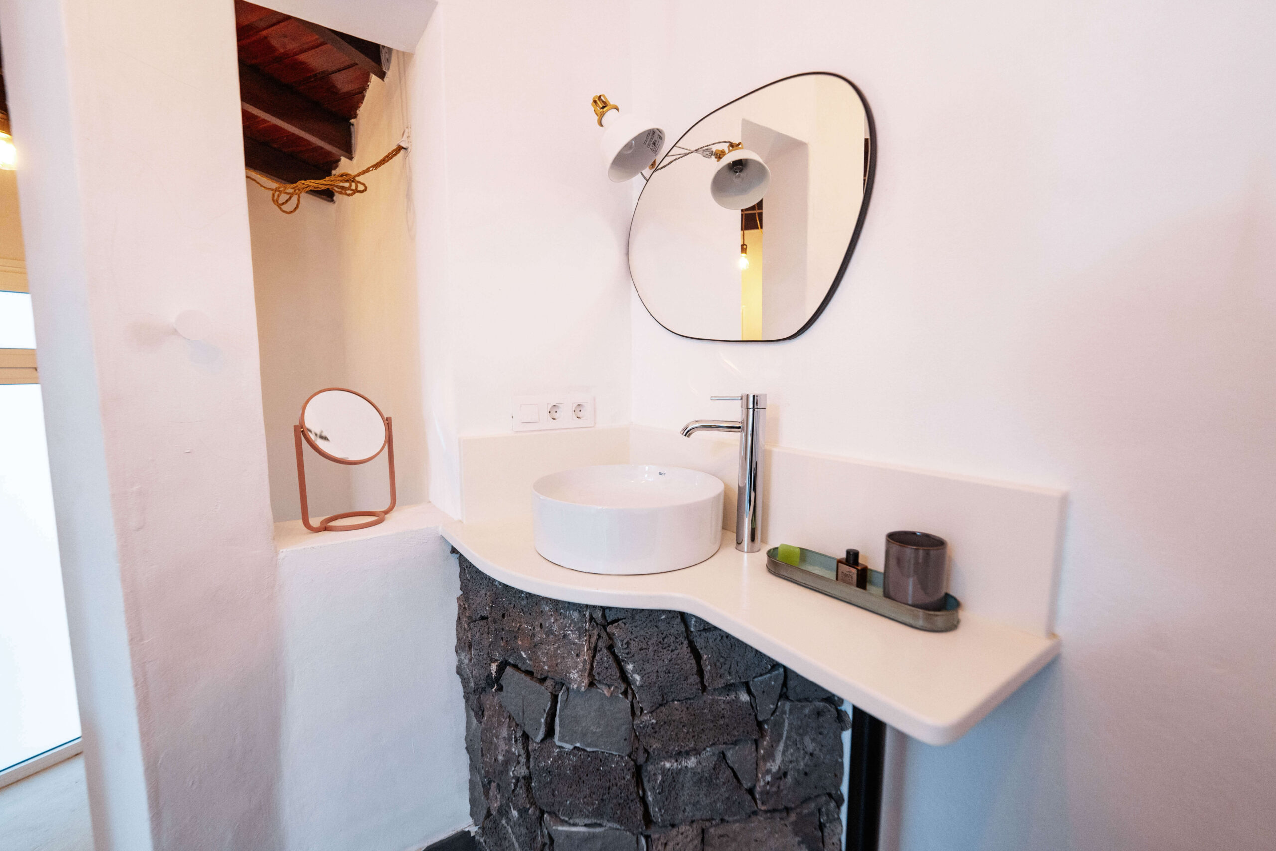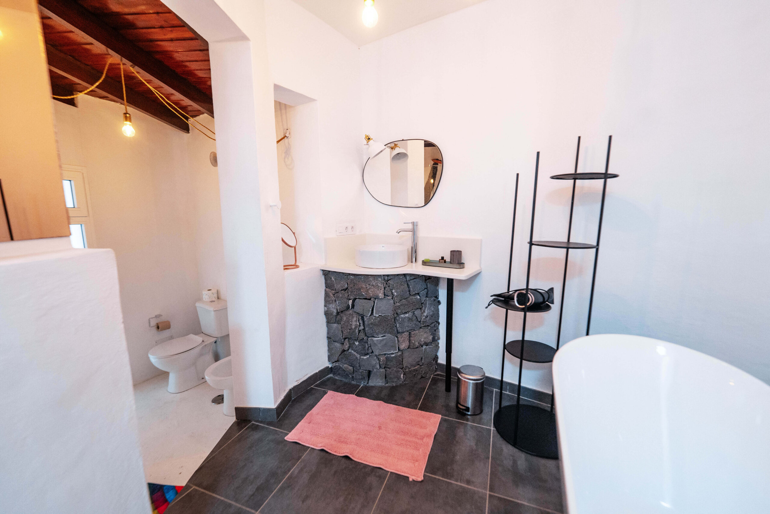 San Bartolome is a modern 68 sqm studio apartment with a private 20 sqm terrace. The terrace features a garden set, umbrella, and deckchairs with views of Montaña Blanca volcano.
